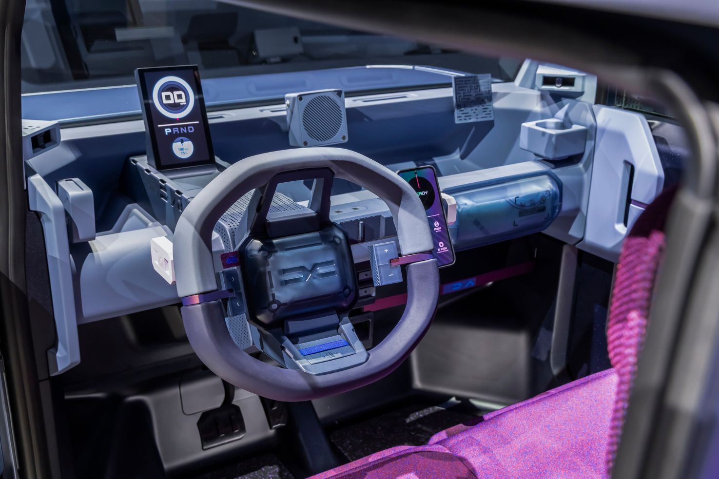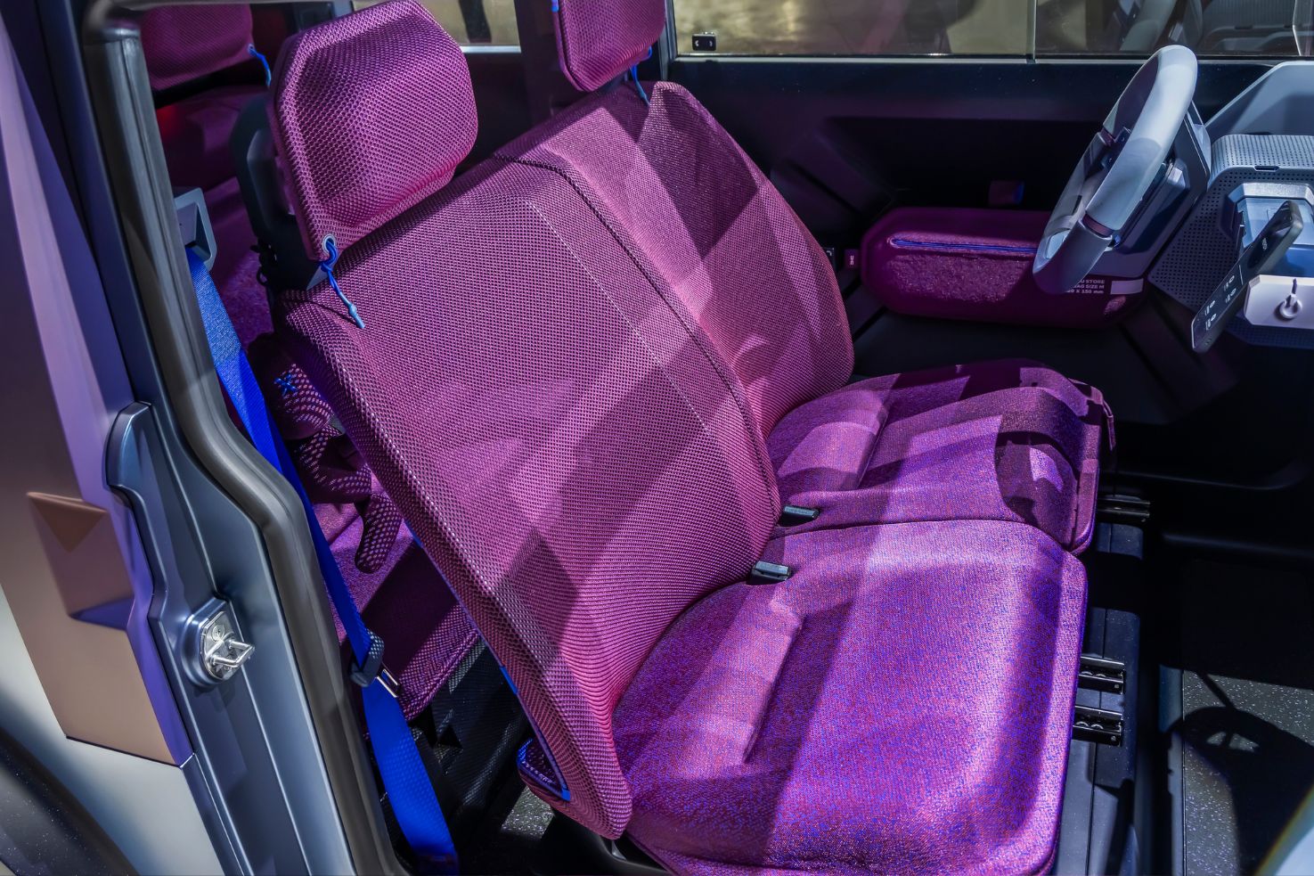 Die Sitze selbst sind einfach konstruiert. Ein sichtbarer Rahmen trägt ein technisches Netzgewebe. Die Vordersitze sind als durchgehende Bank ausgeführt, was an klassische Automobilkonzepte erinnert. Zur Grundausstattung gehören zwei Airbags im Armaturenbrett.