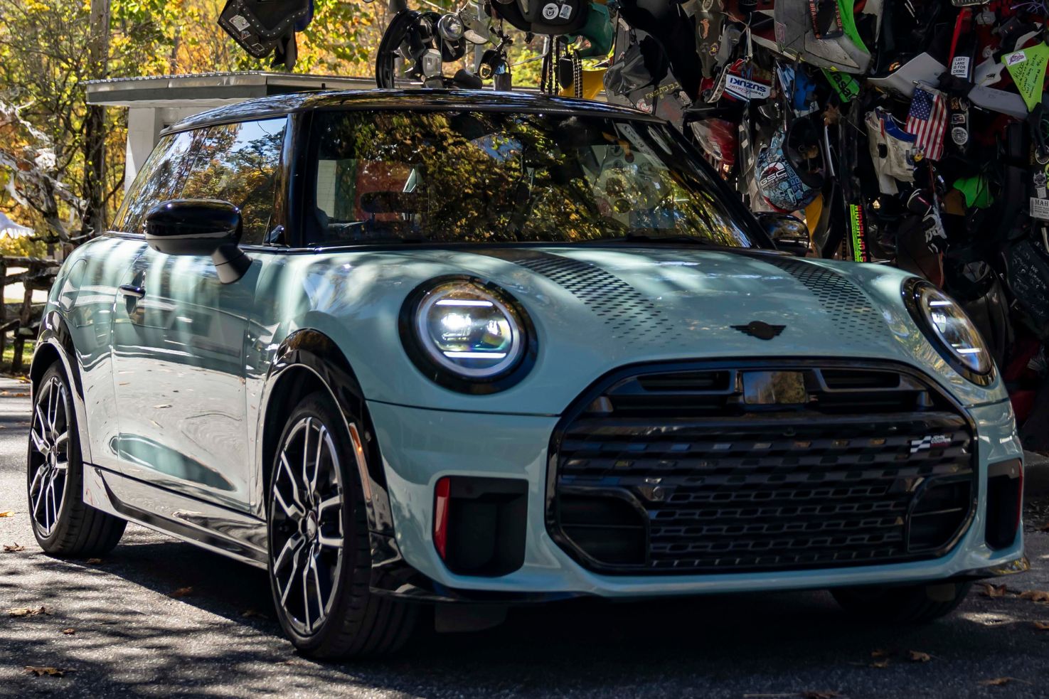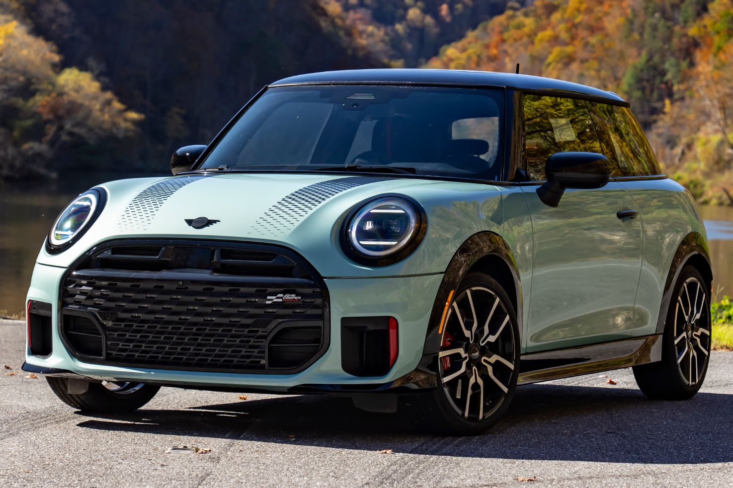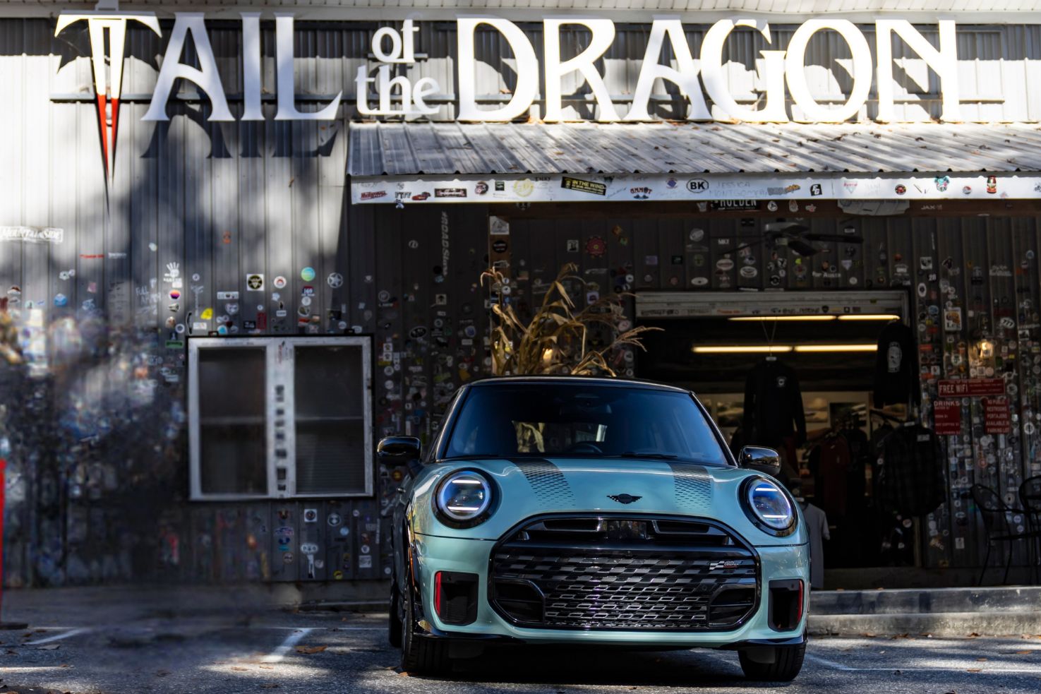 Es ist ein Bild, das wie gemalt wirkt: Die Herbstsonne taucht die Hügel der Great Smoky Mountains in warme Gelb-, Rot- und Orangetöne. Inmitten dieser idyllischen Kulisse steht ein MINI John Cooper Works in der frischen Farbe Ocean Wave Green. Doch die friedliche Szenerie an der Grenze zwischen North Carolina und Tennessee täuscht – denn hier, auf der US-129, befindet sich eine der herausforderndsten Streckenabschnitte, die Amerika zu bieten hat.