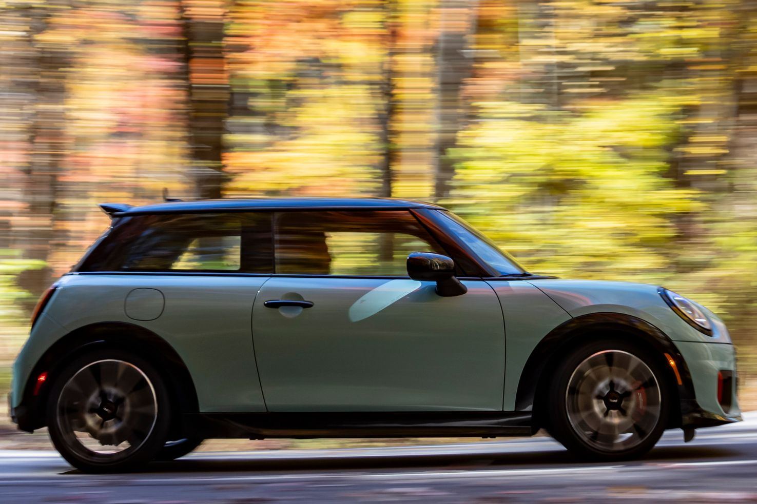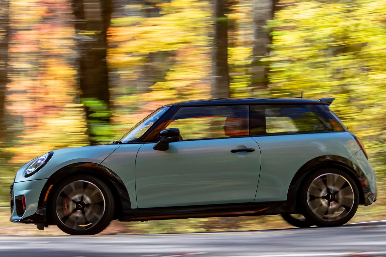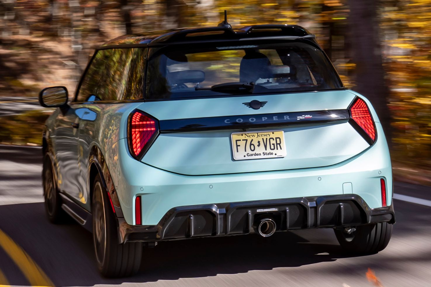 Es ist ein Bild, das wie gemalt wirkt: Die Herbstsonne taucht die Hügel der Great Smoky Mountains in warme Gelb-, Rot- und Orangetöne. Inmitten dieser idyllischen Kulisse steht ein MINI John Cooper Works in der frischen Farbe Ocean Wave Green. Doch die friedliche Szenerie an der Grenze zwischen North Carolina und Tennessee täuscht – denn hier, auf der US-129, befindet sich eine der herausforderndsten Streckenabschnitte, die Amerika zu bieten hat.